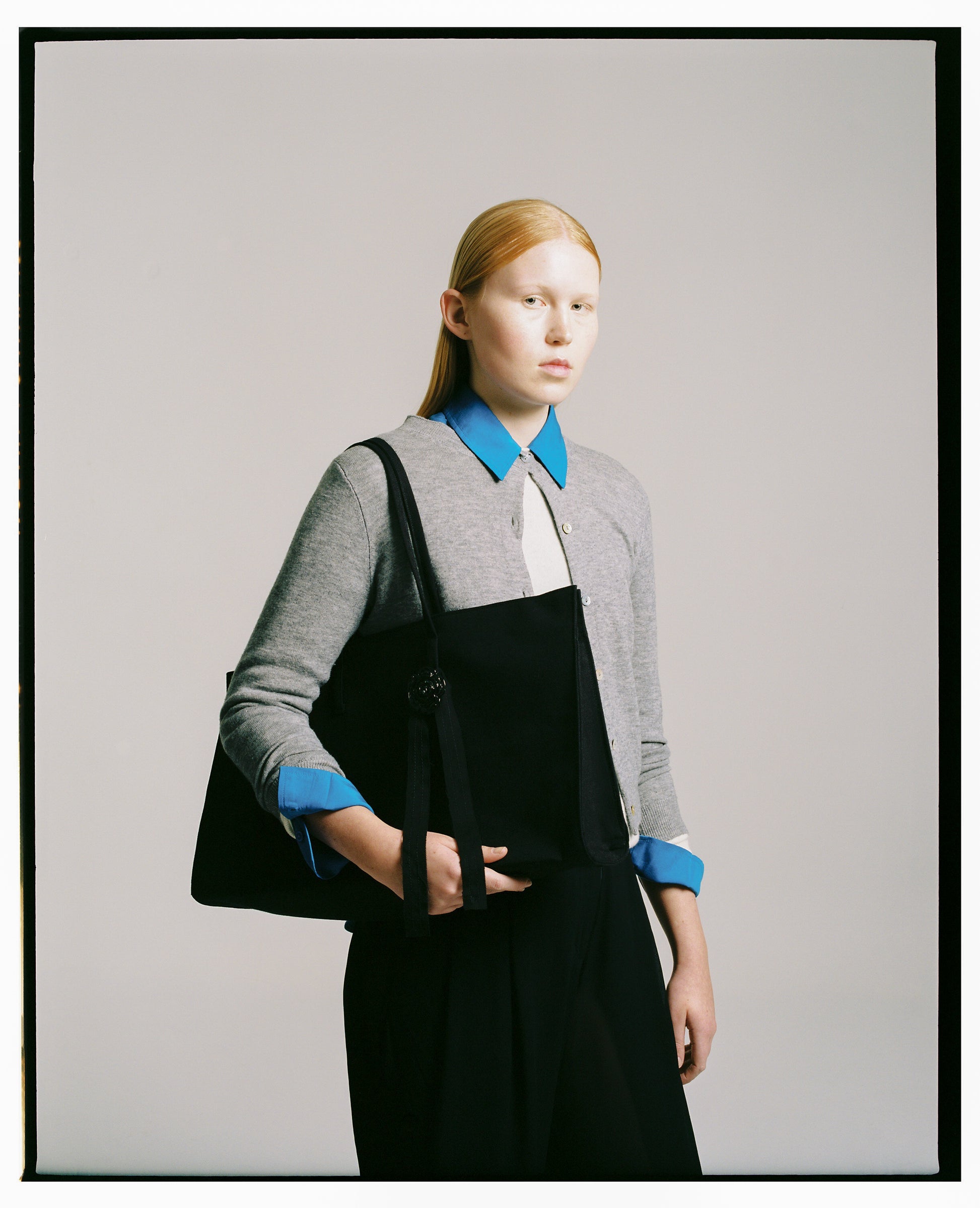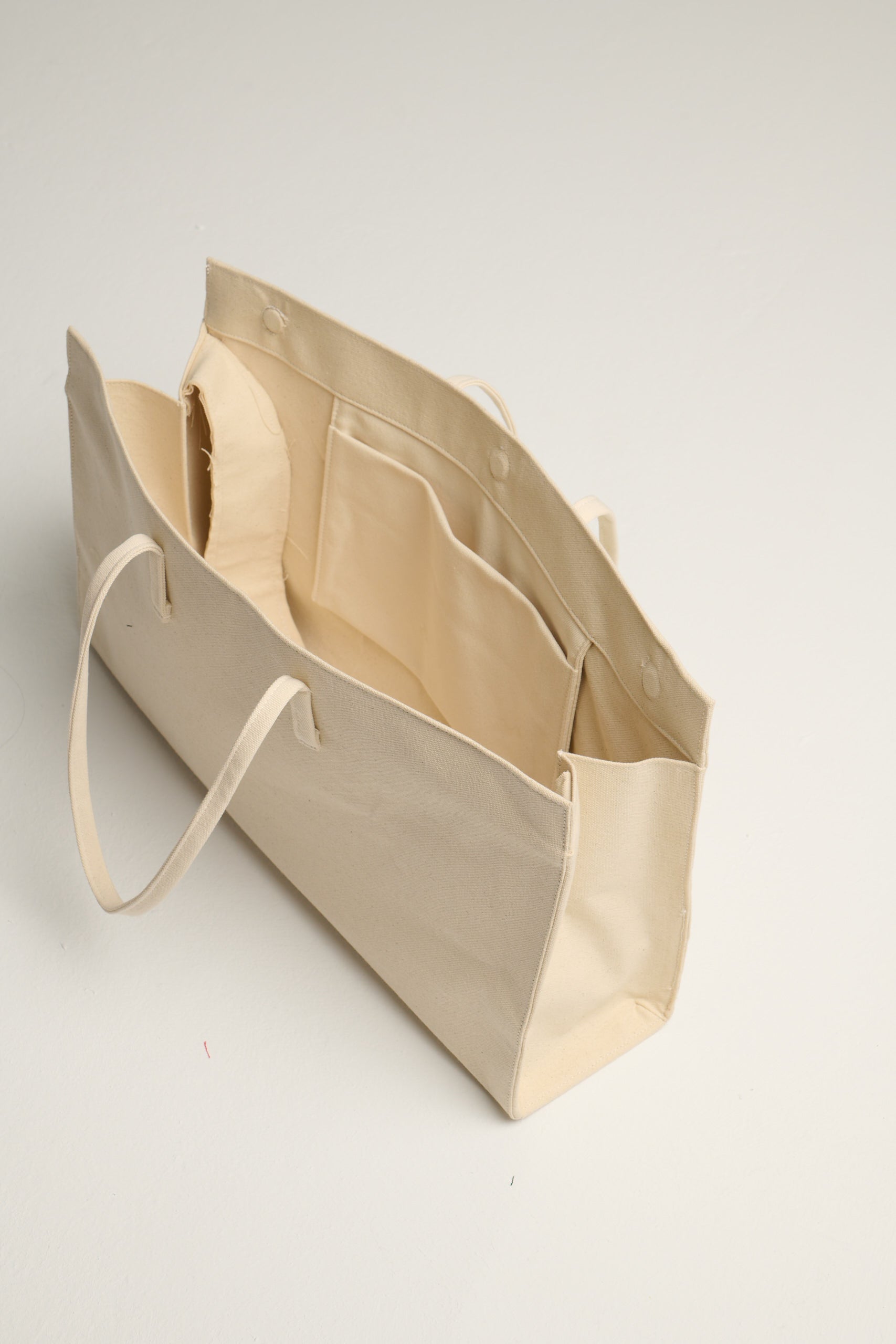 The All Day Bag is crafted from recycled cotton and reinforced with an inner leather structure that gives the piece its sculptural rigidity and organic volume.