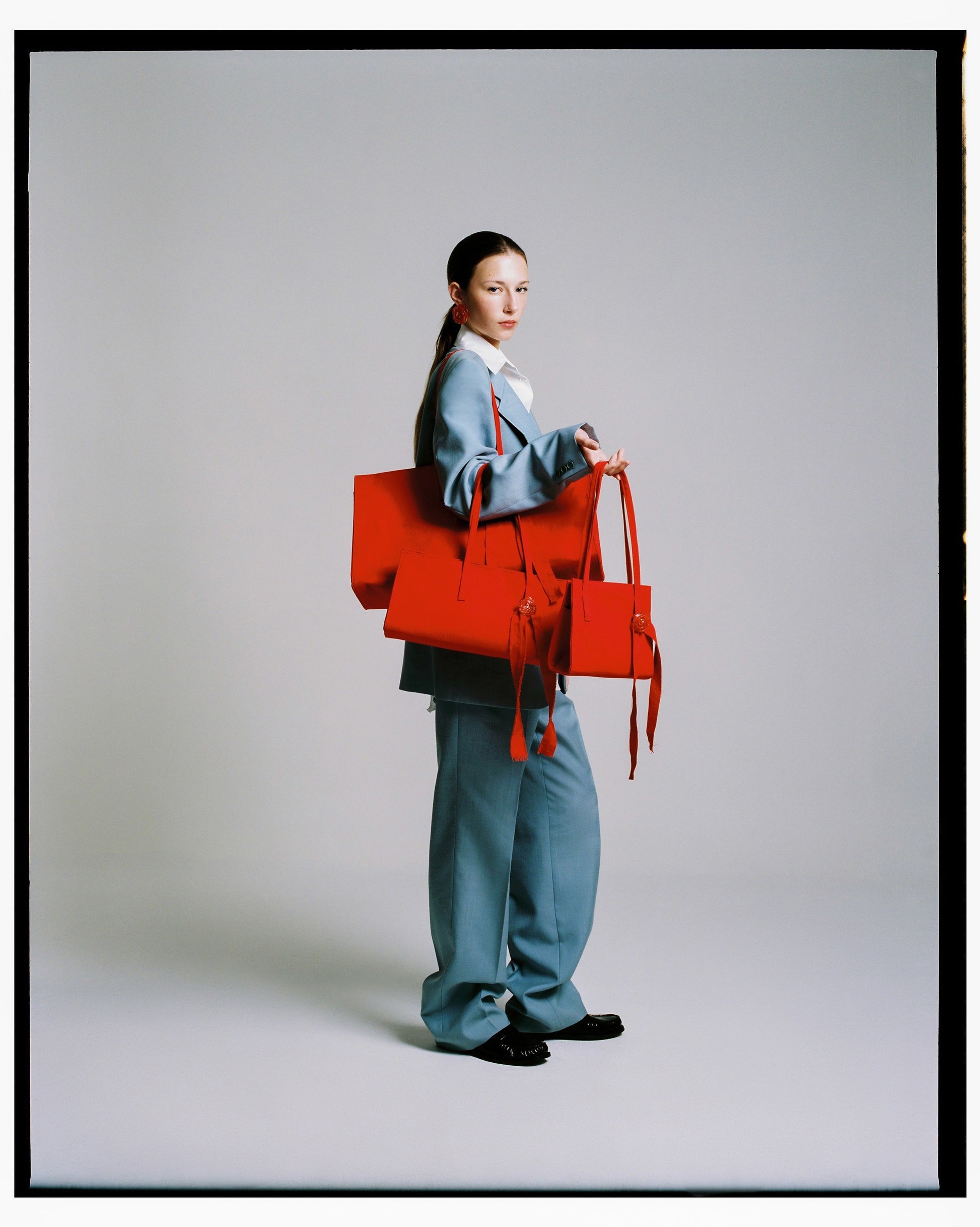 The Baguette Bag is crafted from recycled cotton and reinforced with an inner leather structure that gives the piece its sculptural rigidity and organic volume.