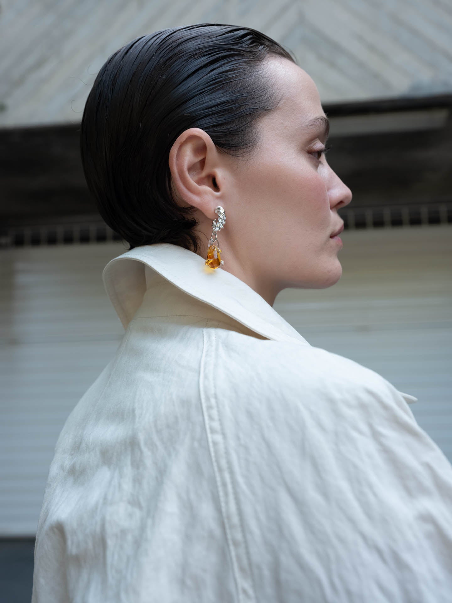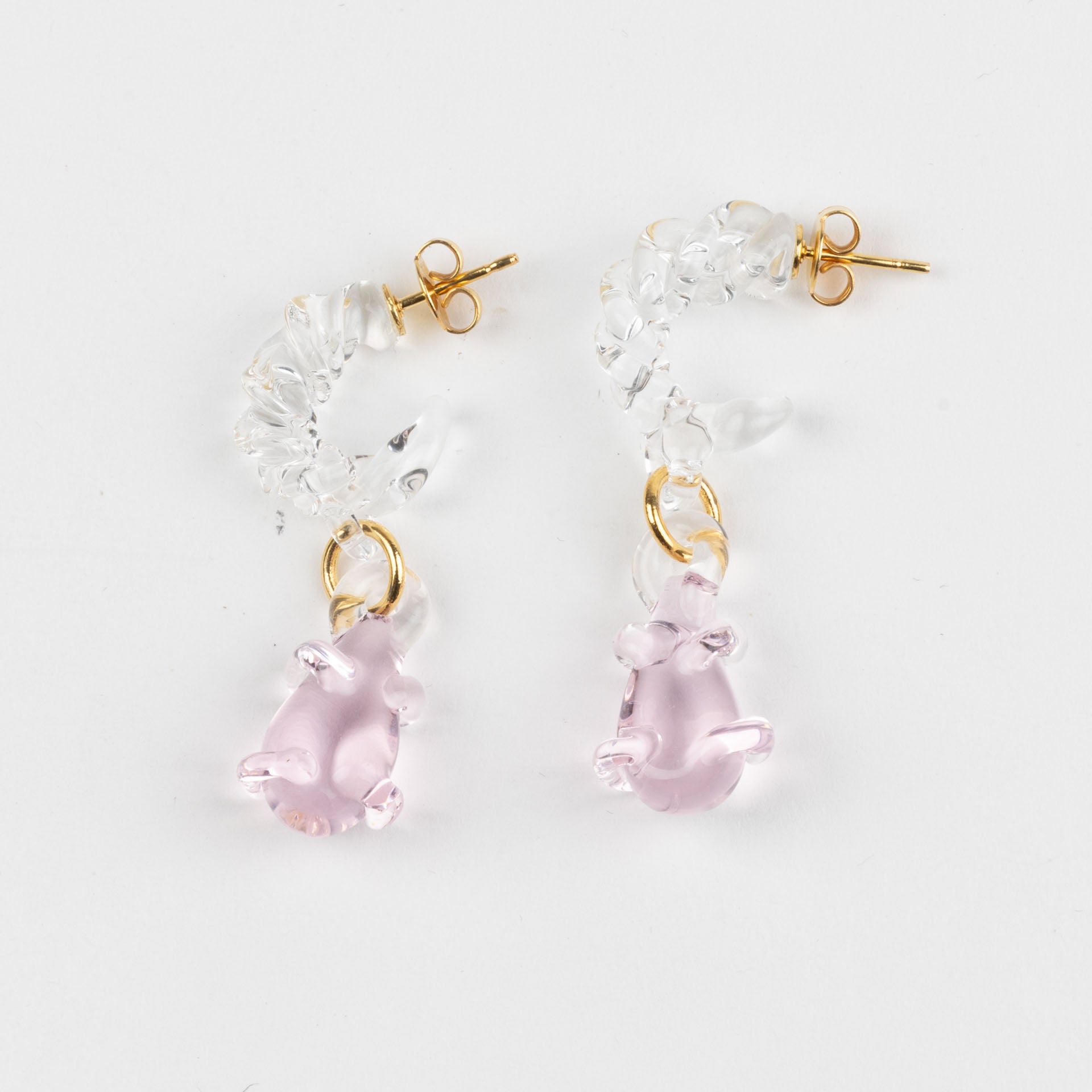 First created in borosilicate glass, they capture the lightness and transparency of water in a sculptural, organic form. They were later reinterpreted in sterling silver and gold-plated brass, preserving their fluid silhouette while translating their gesture into a new material language.